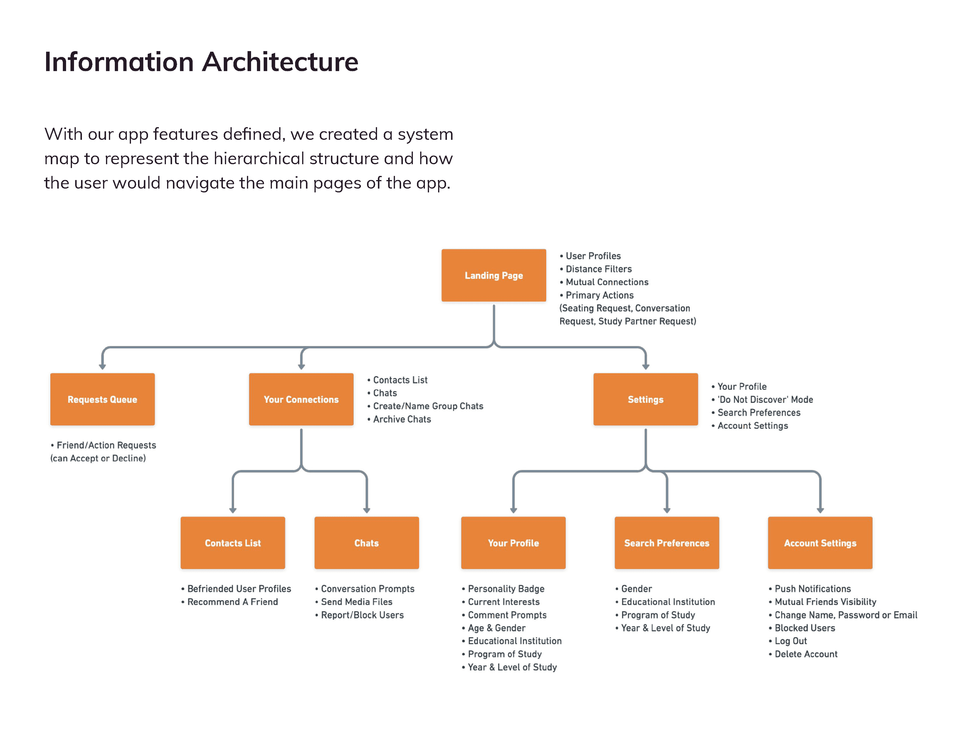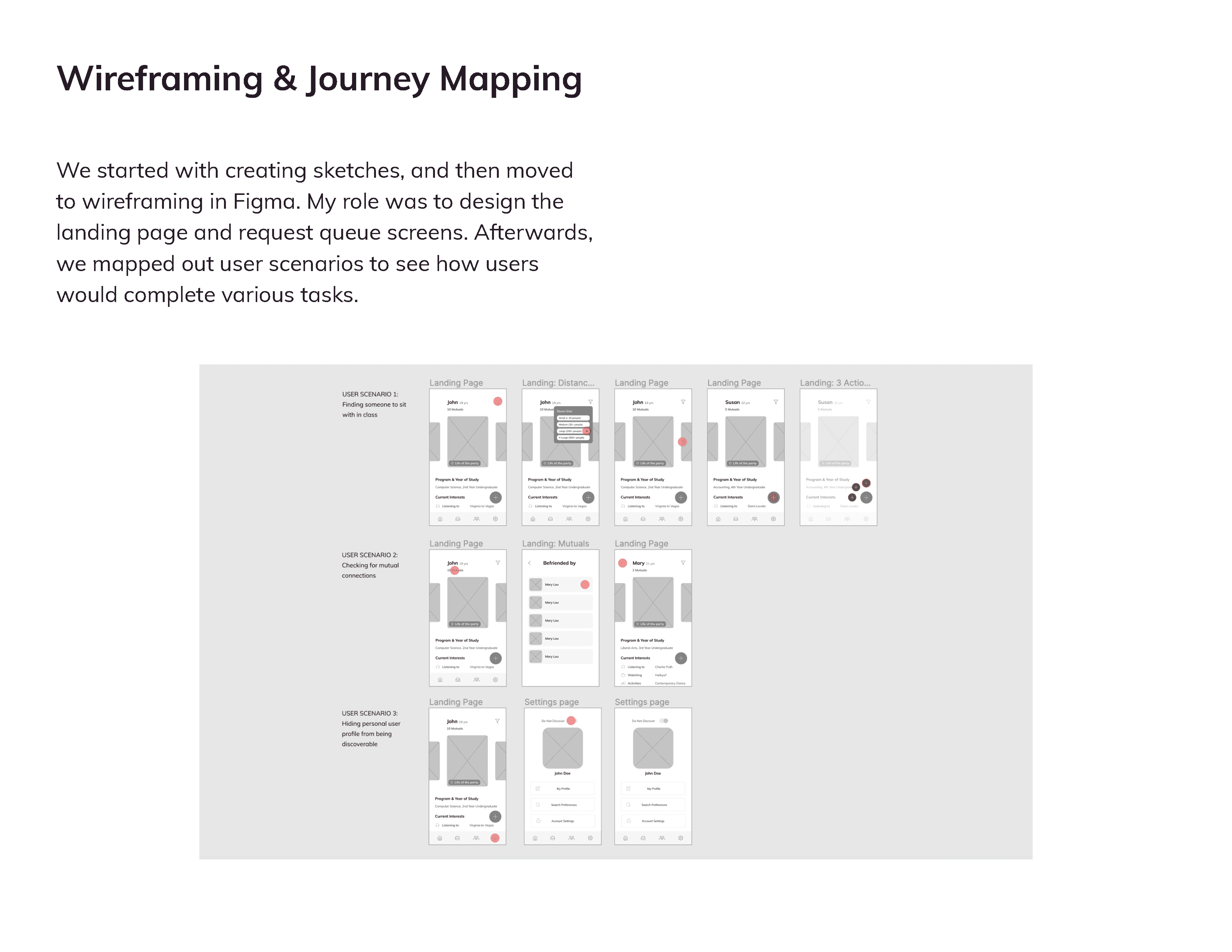 Our next step was to interview 5 postsecondary students and get their honest opinion on what friendship-making actually looks like. Based on their stories, we designed features around profile discovery, seating requests, study buddy matching, and conversation starters—all to encourage easier interaction.