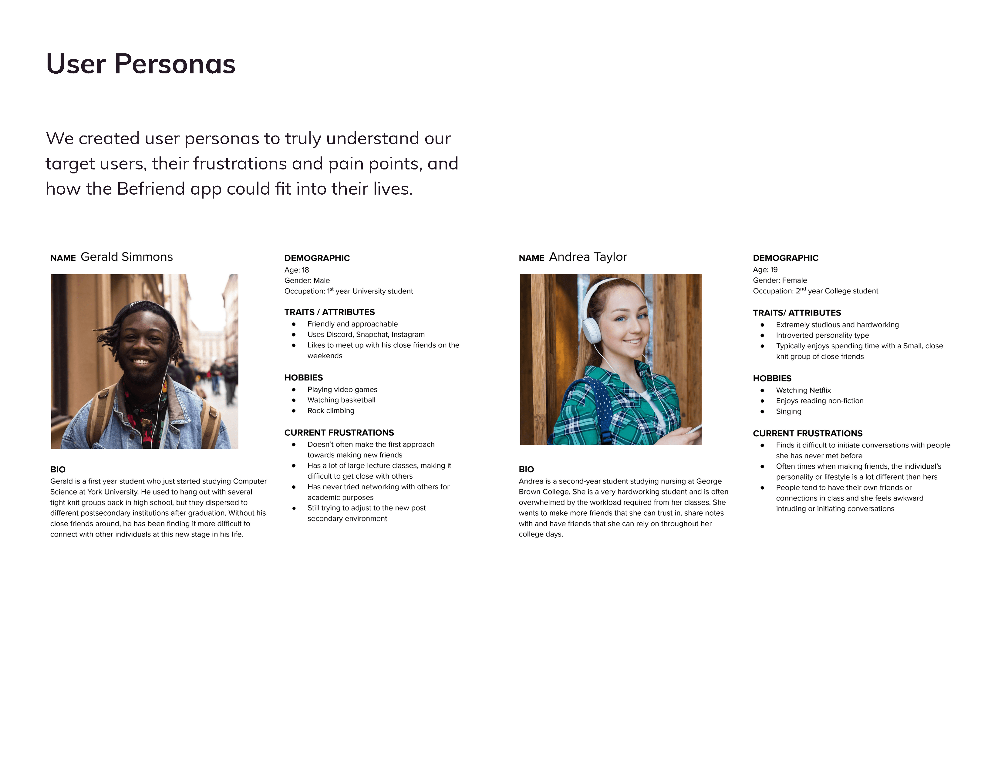 Making friends in postsecondary often feels like trying to find your soulmate in a stadium. How do we build connections in a sea of strangers? Befriend is a conceptual social app that communicates your classmate’s interests and intentions upfront, reducing the anxiety of reaching out first.