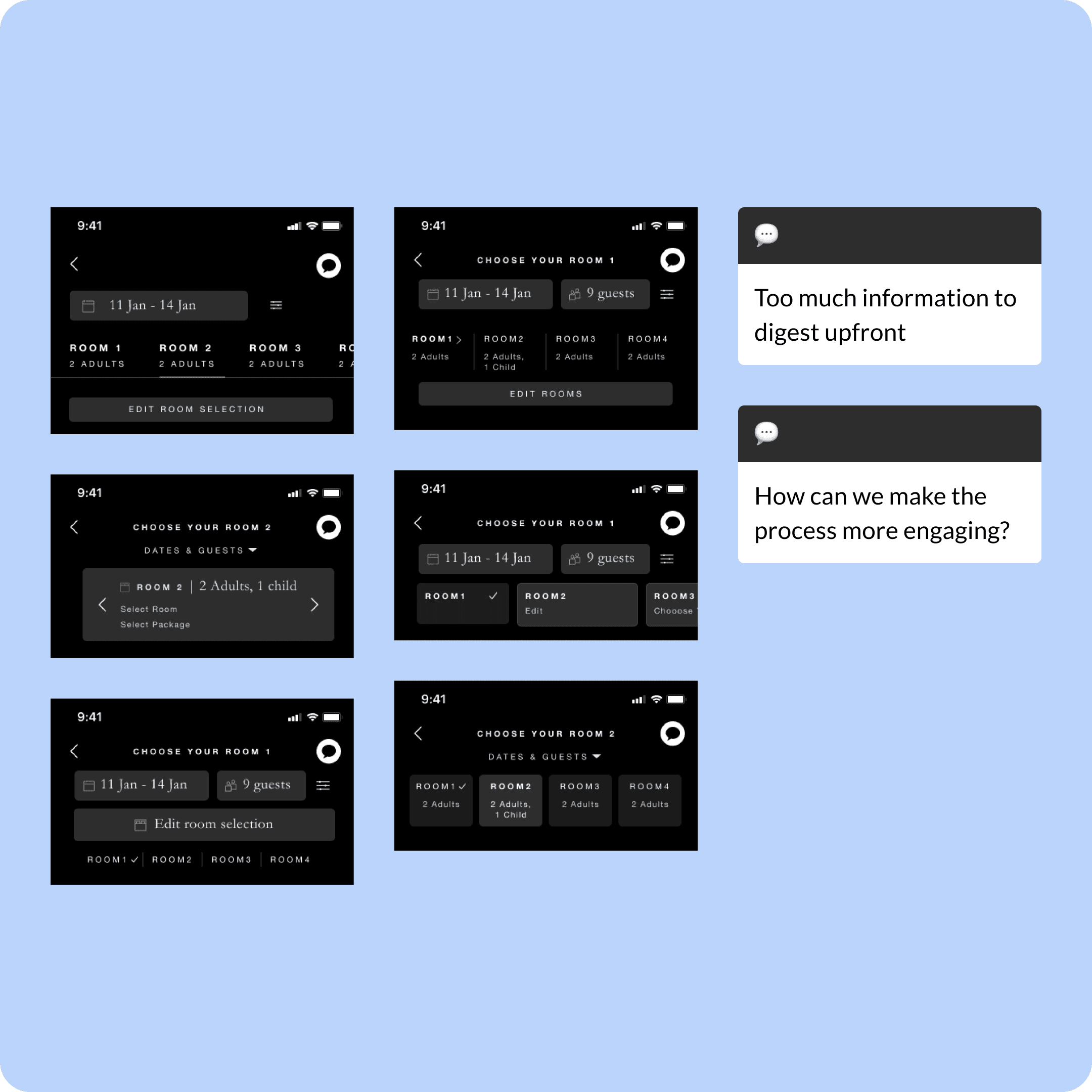 With my initial design explorations, the feedback was that they either weren't engaging enough or there was too much information to digest upfront. Keeping this in mind, I wanted to find out how other competitors handled multi-room bookings.